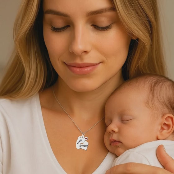 תליון בעיצוב אישי המשלב בין צורת כף רגל תינוק ללב, ליצירת מראה רך, מרגש ומדויק. התכשיט כולל חריטת שם ותאריך לידה בהתאמה אישית, ושיבוץ קריסטל צבעוני לבחירה בהתאם לחודש הלידה. בחירה מושלמת כמתנת לידה לאמא חדשה.