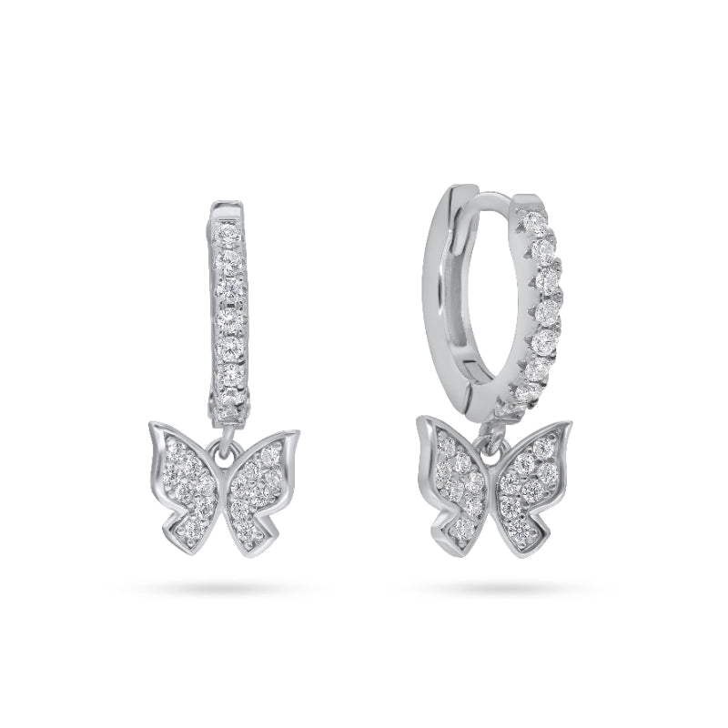 עגילים קלים ואלגנטיים עם נגיעת פנטזיה. גוף העגיל משובץ בזירקונים מנצנצים, ובתחתיתו תלוי פרפר קטן שמוסיף טאץ’ רומנטי ונשי. מושלם להשלמת מראה עדין, גם ליום יום וגם לאירוע מיוחד.